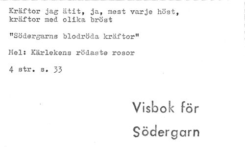 //// Kräftor jag ätit, ja, mest varje höst, kräftor med olika bröst //// "Södergarns blodröda kräftor" Nel: Kärlekens rödaste rosor 4 str. s. 33 //// VisooK för //// Södergarn ////