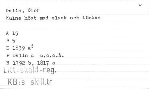 //// Dalin, Olof //// Kulna höst med slask och töcken //// A 15 //// $5 //// E 1839 a3 //// F Dalin d u.o.o.å. //// N 1792 b, 1817 e //// t eg, //// KB :S gatt ////