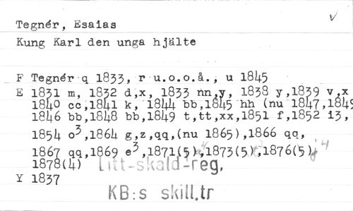 //// Tegnér, Esaias //// Kung Karl den unga hjälte //// F Tegndr-q 1833, u 1845 //// E 1831 m, 1832 d,x, 1833 nny, 1838 7,18 9 v,x 1840 cc,1841 k,-1844 bb,1845 hh (nu '18)47,1845 1846 bb,1848 bb,1849 t,tt,xx,1851 f,1852 i3, //// 1854 03,1864 g,z,qq,(nu 1865)4866 qq, //// 1867 qq,1869 e3,1871(5)91873(5)`4876(5).4- //// 1878(4) lreg, //// Y 1837 //// KB:s ////