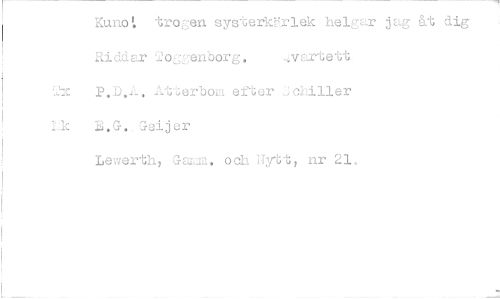 //// Kuno: tregen syoterk'drlek helgar jag åt dig. Ridder 2ojEenborg. ,xartett //// P.D., .,:',.tter-boLl efter Jchiller //// Geijer //// Lewerth, Gwr, och äytt, nr 21. ////