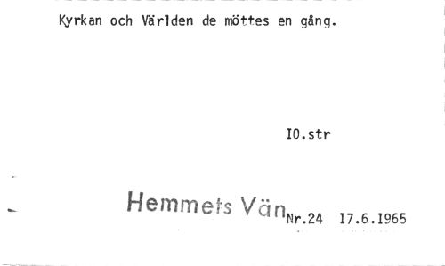 //// Kyrkan och Världen de möttes en gång. //// IO.str //// Hemmets Vän,,,r.24 17.6.1965 ////