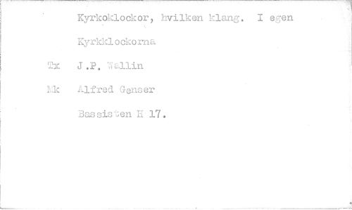 //// Kyrkoklockor, kvilken klang. I egen Kyrkklockorna //// `12x, J .P //// Mc Alfred Ganser //// Bas sisten H 17. ////