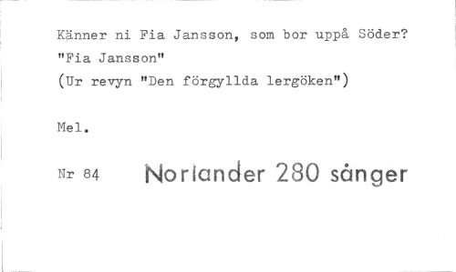 //// Känner ni Fia Jansson, som bor uppå Söder? "Fia Jansson" //// (Ur revyn "Den förgyllda lergöken") //// Mel. //// Nr 84 Noriander 280 sånger ////