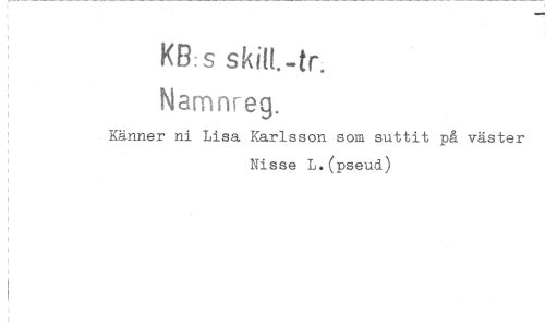 //// KB: s skilt.-tr. //// Namnreg. //// Känner ni Lisa Karlsson som suttit på väster //// Nisse L.(pseud) ////