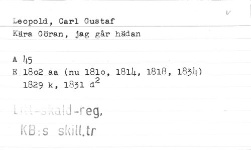 //// Leopold, Carl Gustaf //// Kära Göran, jag går hädan //// A 45 //// E 18o2 aa (nu 181o, 1814, 1818, 1834) //// 1829 k, 1831 d2 //// KB:s skilt tr ////