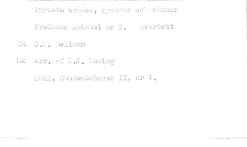 //// K5raäte bröder, systrar och .‘rinner Fredmans äpistel nr 9. ,ivartett. //// Tx 0.h. Bellman //// I k arr. af K.J. horing //// Haha., Studentsänger II, nr 4. ////