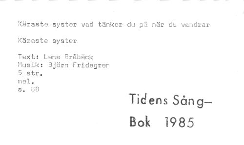//// Käraste syster vad tänker du på när du vandrar Käraste syster //// Text: Lena Bråbäck //// Musik: Björn Fridegren 5 str. //// mel. //// s. 88 //// Tid ens Sån g— //// Bok 1985 ////