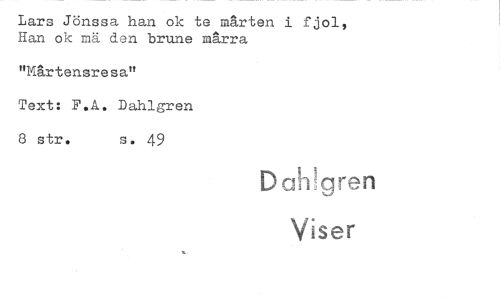 //// Lars Jönssa han ok te mårten i fjol, Han ok mä den brune mårra //// "Mårtensresan //// Text: F.A. Dahlgren 8 str. s. 49 //// D ah!aren //// Viker ////