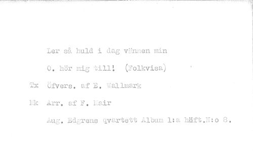 //// Ler så huld i dag vunnen min //// 0. hör mig till: (J'olkvisa) //// Tx efvers. af E. V:allmark //// Lic Arr, af • Lair //// .Ag. EdLrens vartett Album 1:a häft.Nzo 8. ////