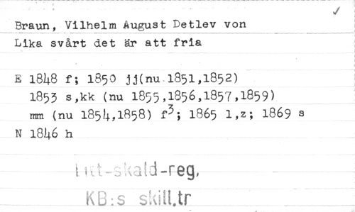 //// Braun, Vilhelm August Detlev von Lika svårt det är att fria //// E 1848 f; 1850 jj(nu_1851,1852) //// 1853 s,kk (nu 1855,1856,1857,1859) //// mm (nu 1854,1858) f3; 1865 1,z; 1869 s N 1846 h //// KILs sätUr ////