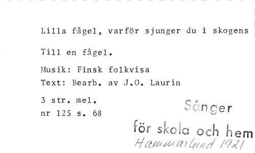 //// Lilla fågel, varför sjunger du i skogens Till en fågel. //// Musik: Finsk folkvisa //// Text: Bearb. av J.O. Laurin //// 3 str. mel. nr 125 s. 68 ncer //// för skola och hem //// /96e,e~ a? b(4d /V //// /