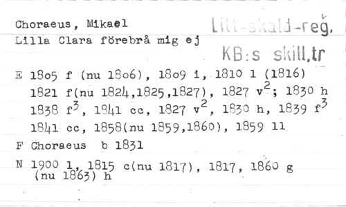 //// Choraeus, Mikael //// 1411a Clara förebrå mig ej //// K[3:s sjLtr //// E 1805 f (nu 18o6), 18o9 i, 1810 1 (1816) 1821 f(nu 1824,1825,1827), 1827 v2; 1830 h 1338 f3, 1941 cc, 1827 v2, 1830 h, 1839 f3 1841 cc, 1858(nu 1859,1860), 1859 11 //// F Choraeus b 1831 //// N 1900 1, 1815 c(nu 1817), 1817, 1860 g (nu 1863) h ////