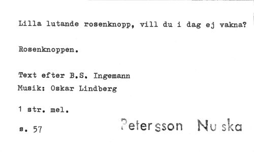 //// Lilla lutande rosenknopp, vill du i dag ej vakna? Rosenknoppen. //// Text efter B.S. Ingemann Musik: Oskar Lindberg //// 1 str, mel. //// 8. 57 eterson Nu ska ////
