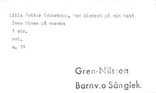 //// Lilla Petter Edderkopp, han klatret på min hatt Imse Vimse på norska //// 1 str. //// mel. //// s. 39 //// Gren-Nils-on //// Barnv o Sånglek. ////