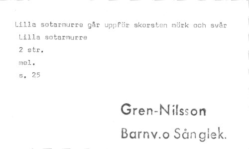 //// Lilla sotarmurre går uppför skorsten mörk och svår Lilla sotarmurre //// 2 str. //// mel. //// s, 25 //// Gren-Nilsson //// Barm° Sånglek. ////