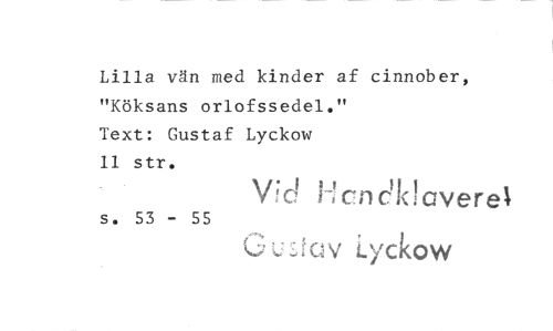 //// Lilla vän med kinder af cinnober, "Köksans orlofssedel." //// Text: Gustaf Lyckow //// 11 str. //// s. 53 - 55 Vid 1- en cldaverel //// C; u.:,felv Lyckow ////