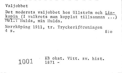 //// Valjobbet //// Det moderata valjobbet hos Ullström och Lin-kopin (I valkrets man kopplat tillsamman .,.) mei.: Hulda, min Hulda. //// Norrköping 1911, tr. Tryckeriföreningen //// 4 s. 8:o //// KB okat. Vitt. sv. hist. 1001 1871 - ////