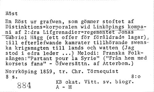 //// Röst //// En Röst ur grafwen, som gömmer stoftet af Distinktions=korporalen wid Linköpings kompani af 2:dra Lifgrenadier=regementet Jonas - Gabriel Hägg (ett offer för föråldrade lagar), till efterlefwande kamrater tillhörande swens ka krigsmagten till lands och watten (Jag //// stod i edra leder ...) Melodi: Franska Folksången:"Partantpour la Syrie" ("Från hem med korsets fana" - öfwersättn. af Atterbom.) //// Norrköping 1859, tr. Chr. Törnequist //// 8 s. 8:o //// 884 KB -H okat. Vitt. sv. biogr. //// A ////