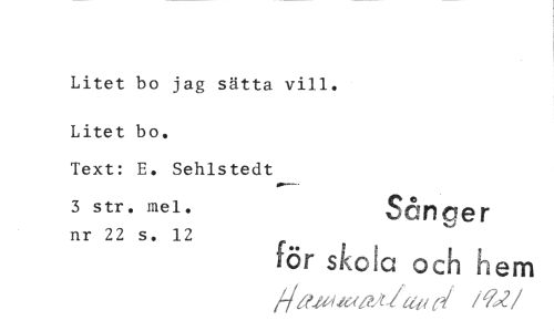 //// Litet bo jag sätta vill. //// Litet bo. //// Text: E. Sehlstedt //// 3 str. mel. Sån e r //// nr 22 s. 12 f'or skola och hem //// /lbtea.texa,y_lau( /92 //// /