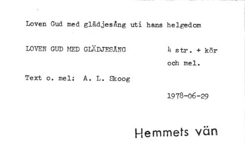 //// Loven Gud med glädjesång uti hans helgedom LOVEN GUD MED GLÄDJESÅNG 4 str. + kör //// Text o. mel: A. L. Skoog och mel. //// 1978-06-29 //// Hemmets vän ////