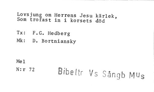 //// Lovsjung om Herrens Jesu kärlek, Som trofast in i korsets död //// Tx: F.G. Hedberg Mk: D. Bortniansky //// Mel //// N:r 72 Bibeltr Vs Sångb Mus ////