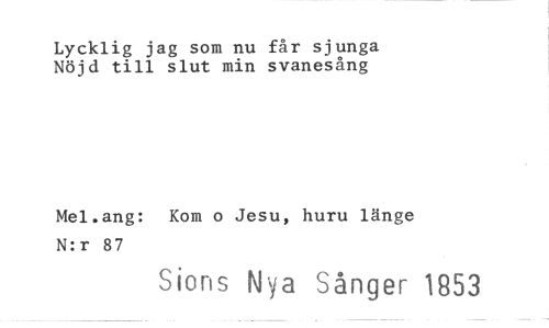 //// Lycklig jag som nu får sjunga Nöjd till slut min svanesång //// Mel.ang: Kom o Jesu, huru länge N:r 87 //// Sions Nya Sånger 1853 ////