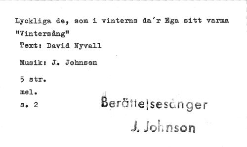 //// Lyckliga de, som i vinterns da'r Bga sitt varma //// "Vintersångn //// Text: David Nyvall //// Musik: J. Johnson ger5,teisesCin ger //// 5 str. J. JU- nson //// mel. so 2 ////