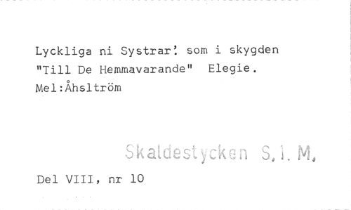 //// Lyckliga ni Systrar: som i skygden "Till De Hemmavarande" Elegie. Mel:Åhsltröm //// Skattiest i Å n S, 1. N4, //// Del VIII, nr 10 ////