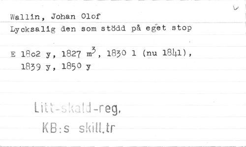 //// Wallin, Johan Olof //// Lycksalig den som stödd på eget stop //// E leoz y, 1827 m3, 1850 1 (nu 1841), //// 1839 y, 1850 y //// EAU J-reg, //// KB:s skilt tr ////