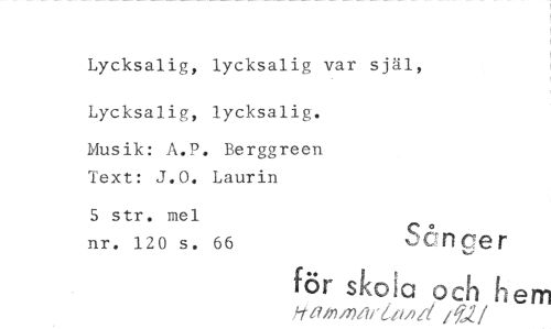 //// Lycksalig, lycksalig var själ, Lycksalig, lycksalig. //// Musik: A.P. Berggreen Text: J.0. Laurin //// 5 str. mel nr. 120 s. 66 o„ //// ncer //// för sko a ach hem //// 9,597)fivi, ////