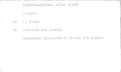 //// Lycksalighetens sköna land: //// Luplett //// Tx. J. Jolin //// 1.1c Åhlström och .äandel //// Cescrines liapletter i Uärlek och 1;goism ////