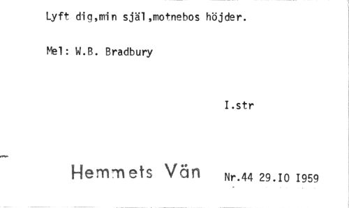 //// Lyft dig,min själ,motnebos höjder. Mel: W.B. Bradbury //// I .str //// Hemmets Vän Nr.44 29.10 1959 ////