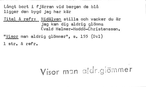 //// Långt bort i fjärran vid bergen de blå ligger den bygd jag har kär //// Titel & refr: Nidälven stilla och vacker du är jag kan dig aldrig glömma //// Evald Helmer-Hoddö-Christenssen. //// "Visor man aldrig glömmer", s. 155 (D:1) 1 str. & refr. //// Visor ms:in :örn ni e r ////