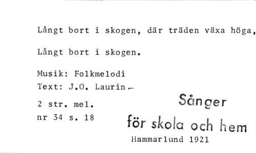 //// Långt bort i skogen, där träden växa höga, Långt bort i skogen. //// Musik: Folkmelodi Text: J.0. Laurin- //// 2 str. mel. Sånger //// nr 34 s. 18 för skola och hem //// Hammarlund 1921 ////