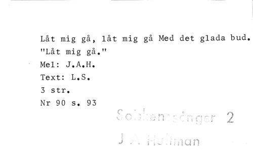 //// Låt mig gå, låt mig gå Med det glada bud. "Låt mig gå." //// Mel: J.A.H. //// Text: L.S. //// 3 str. //// Nr 90 s. 93 //// n ////