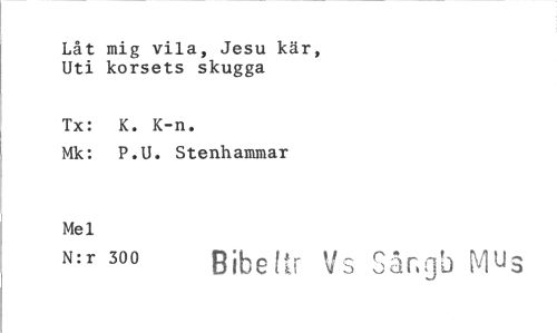 //// Låt mig vila, Jesu kär, Uti korsets skugga //// Tx: K. K-n. //// Mk: P.U. Stenhammar //// Mel //// N:r 300 BibeL Sångb Mus ////