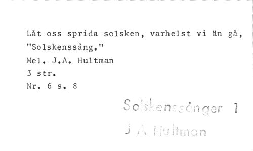 //// Låt oss sprida solsken, varhelst vi än gå, "Solskenssång." //// J.A. Hultman //// 3 str. //// Nr. 6 s. 8 //// nrier R3 h' Cl n ////