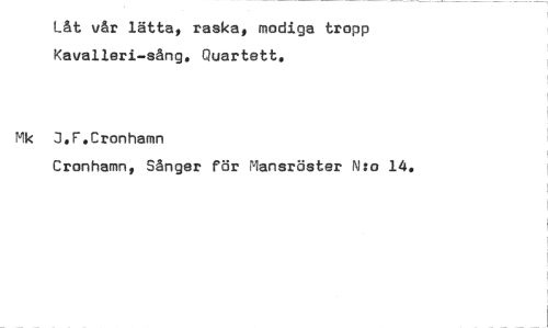 //// Låt vår lätta, raska, modiga tropp Kavalleri-sång. Quartett. //// Mk J.F.Cronhamn //// Cronhamn, Sånger för Mansröster N:o 14. ////
