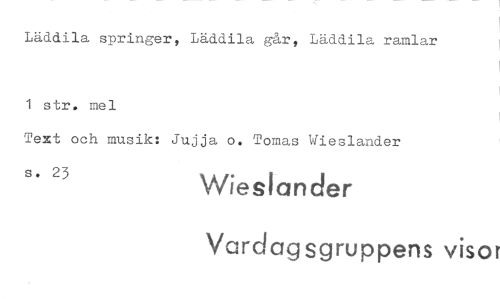 //// Låddila springer, Läddila går, Läddila ramlar //// 1 str. mel //// Text och musik: Jujja o. Tornas Wieslander //// s. 23 Wieslander //// Vardagsgruppens visor ////