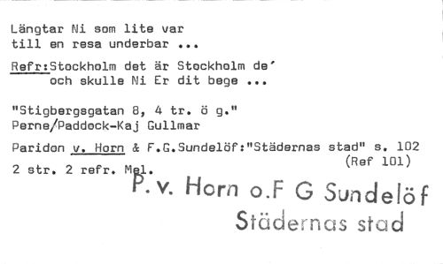 //// Längtar Ni som lite var till en resa underbar //// Refr:Stockholm det är Stockholm de' och skulle Ni Er dit bege ... //// "Stigbergsgatan 8, 4 tr. ö g." Perne/Paddock-Kaj Gullmar //// Paridon v. Horn & F.G.Sundelöf:"Städernas stad" s. 102 2 str. 2 refr. Mal. (Ref 101) //// P. v. Horn o.F G Sundeföf //// Städernas stad ////