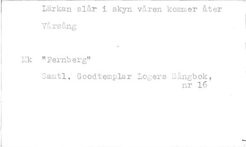 //// Lärkan slår i skyn våren kommer åter Vårsång //// rk "Fernberg" //// Samtl. Goodtemplar Logers Sångbok, //// nr 16 ////