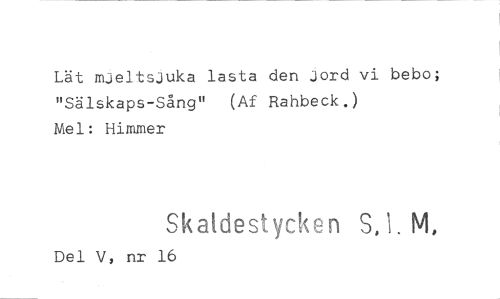 //// Lät mJeltsJuka lasta den Jord vi bebo; "Sälskaps-Sång" (Af Rahbeck.) //// Mel: Himmer //// Skaldestyck n S,1. NI, //// Del V, nr 16 ////