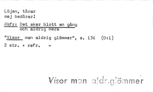 //// Löjen, tårar //// mej bedårar: //// Röfr: Det sker blott en gång //// och aldrig mera //// "Visor man aldrig glömmer", s. 136 (D:1) //// 2 str. + refr. - //// Vh'.or ni-2n -..Vdr.g6inmer ////