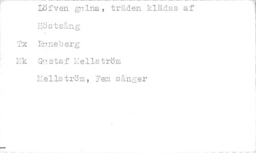 //// Löfven gulna, träden klädas af //// Höstsång Tx Runeberg Mk Gustaf Hellström //// Hellström, Fem sånger ////