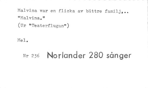 //// Malvina var en flicka av bättre familj,.. "Malvina." //// (Ur "Teaterflugan") //// Mel. //// Nr 236 Norlander 280 sånger ////