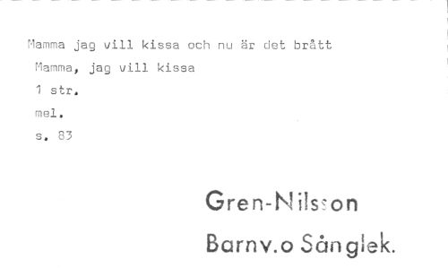 //// Mamma jag vill kissa och nu är det brått Mamma, jag vill kissa //// 1 str. //// mei. //// s. 83 //// Gren-Nils on //// Barnv.o Sånglek. ////