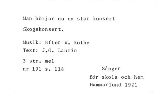 //// Man börjar nu en stor konsert Skogskonsert. //// Musik: Efter W. Kothe Text: J.0. Laurin //// 3 str. mel //// nr 191 s. 118 Sånger //// för skola och hem Hammarlund 1921 ////