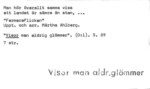 //// Man hör överallt samma visa //// att landet är sämre än stan, ... //// "Farmareflickan" //// Uppt. och arr. Märtha Ahlberg. //// "Visor man aldrig glömmer". (D:1). S. 89 7 str. //// Visor nian aldr.giörnmer ////