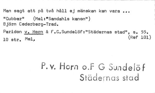 //// Man sagt att på två håll ej mänskan kan vara ... //// "Gubbar" (Mel:"Sandahls kanon") //// Björn Cederberg-Trad. //// Paridon v. Horn & F.G.Sundeldf:"Städernas stad", s. 55. 10 str. Mal. (Ref 101) //// P.v. Horn o.F G SJadeiöf //// Städernas stod ////