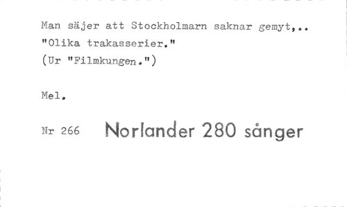 //// Man säjer att Stockholmarn saknar gemyt,.. "Olika trakasserier." //// (Ur "Filmkungen.") //// Nr 266 Norlander 280 sånger ////
